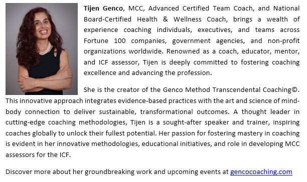 Are you prepared to elevate your coaching practice and embark on a journey of mastery? Join Master Certified Coach (MCC) Tijen Genco for a transformative, experiential session that brings the distinctions between ACC, PCC, and MCC-level coaching to life and has a dialogue with you on how to keep evolving beyond the obtainment of MCC. This session transcends traditional presentations—it’s about stepping into embodied transformation and unlocking your next level of coaching mastery.